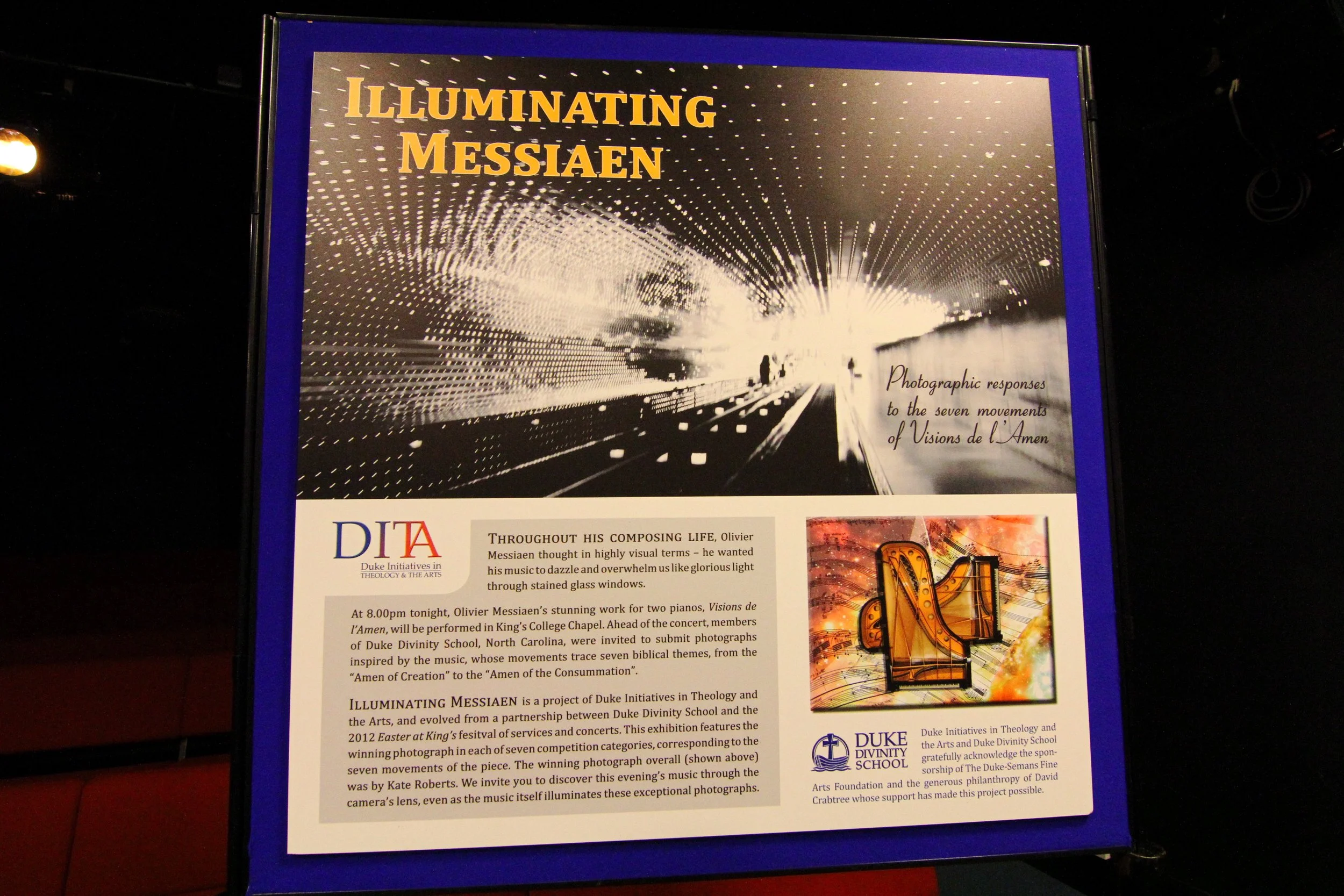 DITA Director Jeremy Begbie performs and explicates the theological structure of “Visions de l’Amen” by French composer and Roman Catholic Olivier Messiaen. Begbie is joined by Cordelia Williams, a London-based concert pianist, for this piece for four hands. Premiering on Good Friday, the performance takes place in King’s College Chapel in a gallery of prize-winning photographs from Duke Divinity students, faculty, and staff. The evening was a key event in the 2012 Easter at King’s festival.